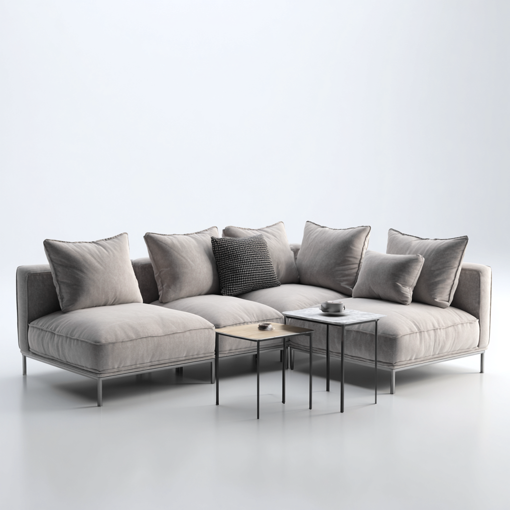 La configurazione modulare permette un facile adattamento dello spazio, rendendo il divano adatto a diverse disposizioni. Il tavolino offre un piano pratico e stabile, utile per oggetti quotidiani e decorazioni.