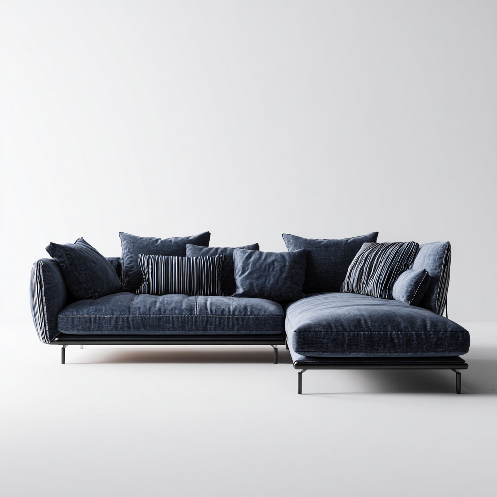 Questo divano angolare dal design moderno unisce stile contemporaneo e comfort elevato. Il suo rivestimento in tessuto blu e la forma accogliente lo rendono ideale per il soggiorno, creando uno spazio perfetto per il relax quotidiano.