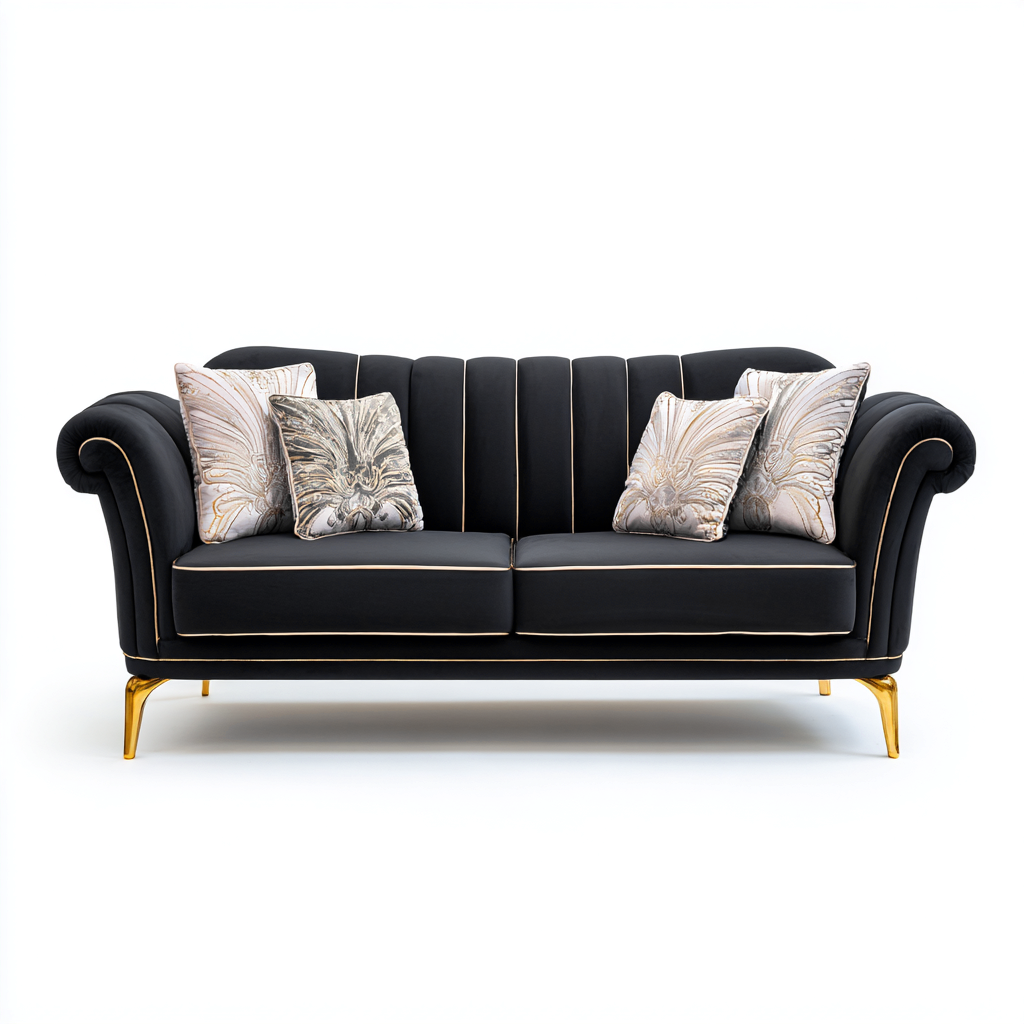 Questo divano lineare in velluto nero con dettagli dorati rappresenta un perfetto connubio tra lusso e comfort. Il suo design elegante e sofisticato è ideale per chi desidera un elemento d'arredo raffinato che valorizzi il soggiorno con un tocco di classe.