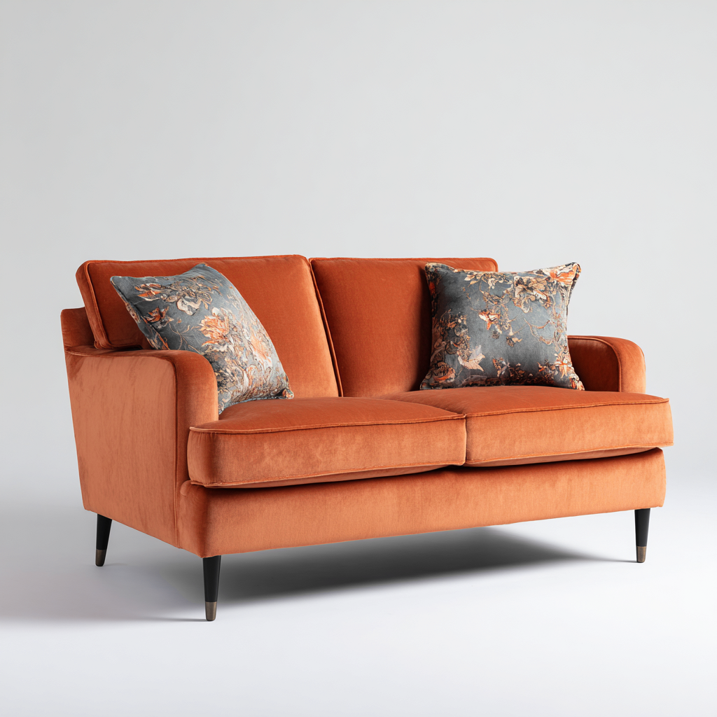 Questo divano lineare in velluto arancione unisce eleganza moderna e comfort, ideale per valorizzare il soggiorno con un tocco caldo e accogliente.