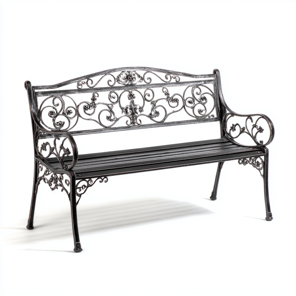 La panca è realizzata in metallo resistente con finitura nera. Le parti decorative includono motivi floreali e riccioli lavorati, abbinati a una superficie verniciata che contribuisce alla protezione contro gli agenti atmosferici.