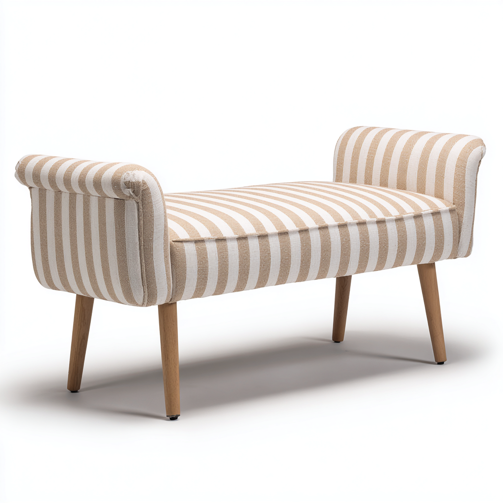 La seduta è rivestita in tessuto a righe beige e bianco, caratterizzato da una texture piacevole e da cuciture curate. Le gambe sono realizzate in legno con una finitura naturale che aggiunge stabilità e un tocco caldo all'estetica del prodotto.