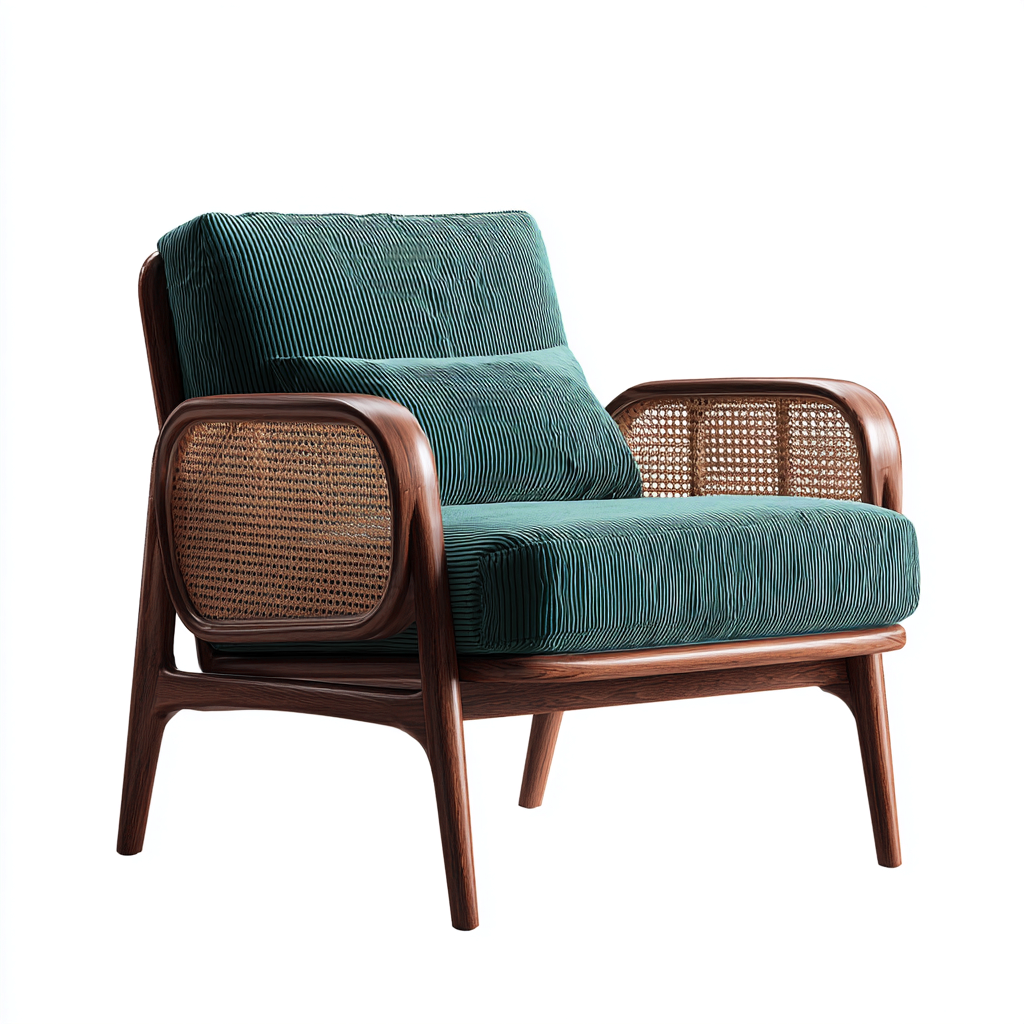 Questa poltrona in tessuto blu petrolio offre una combinazione equilibrata di comfort e stile vintage, risultando ideale per il soggiorno. La struttura in legno curvato e i pannelli laterali intrecciati conferiscono un aspetto naturale e accogliente agli spazi domestici.