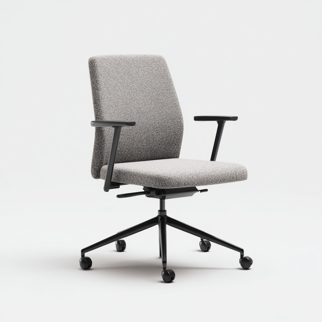 Questa sedia da ufficio presenta una seduta in tessuto grigio e una solida base in metallo, offrendo comfort e stabilità per l'uso quotidiano in ambiente di lavoro.