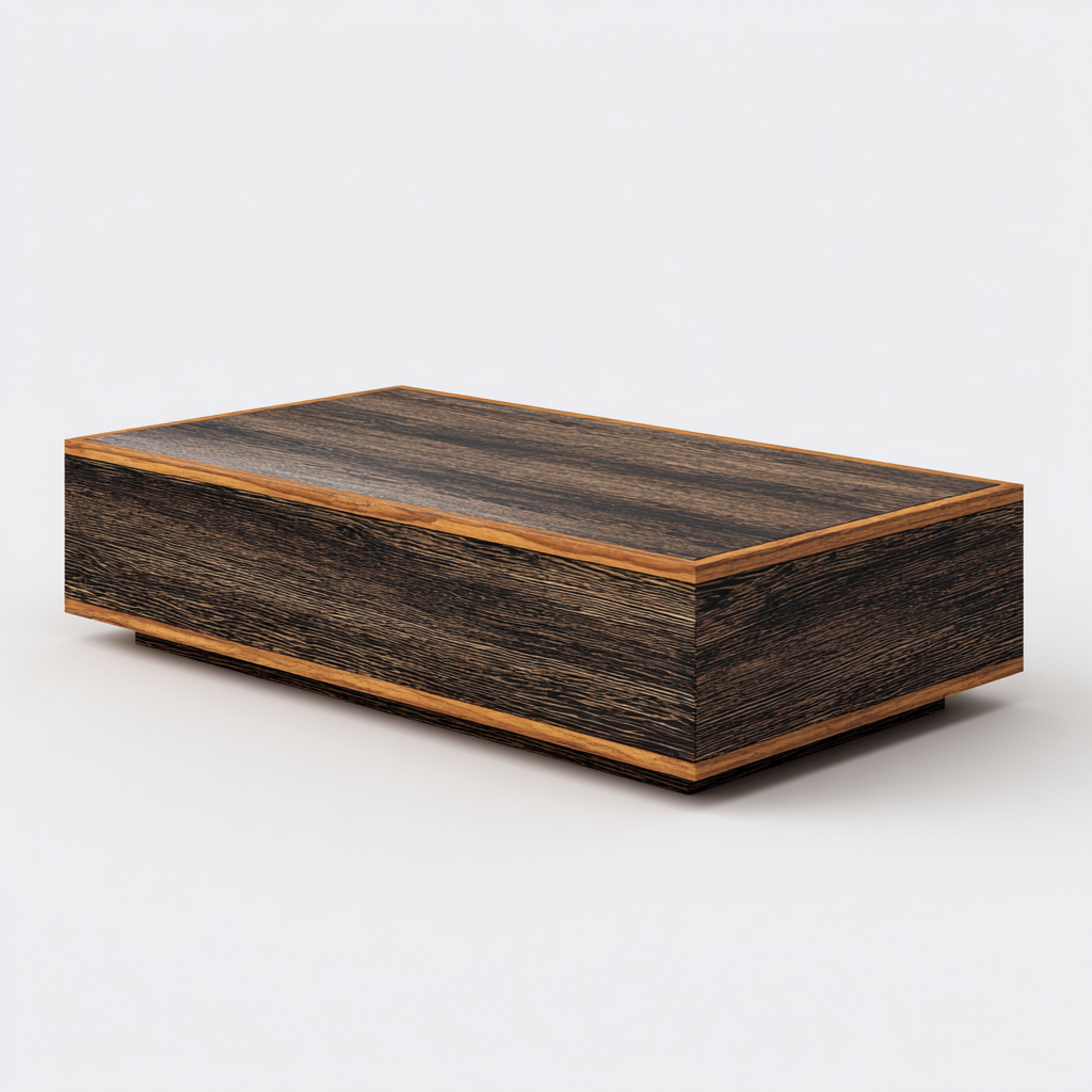 La superficie liscia mostra venature naturali in tonalità scure mentre i bordi più chiari creano un contrasto elegante. La lavorazione accurata assicura una struttura stabile e una presenza visiva solida.