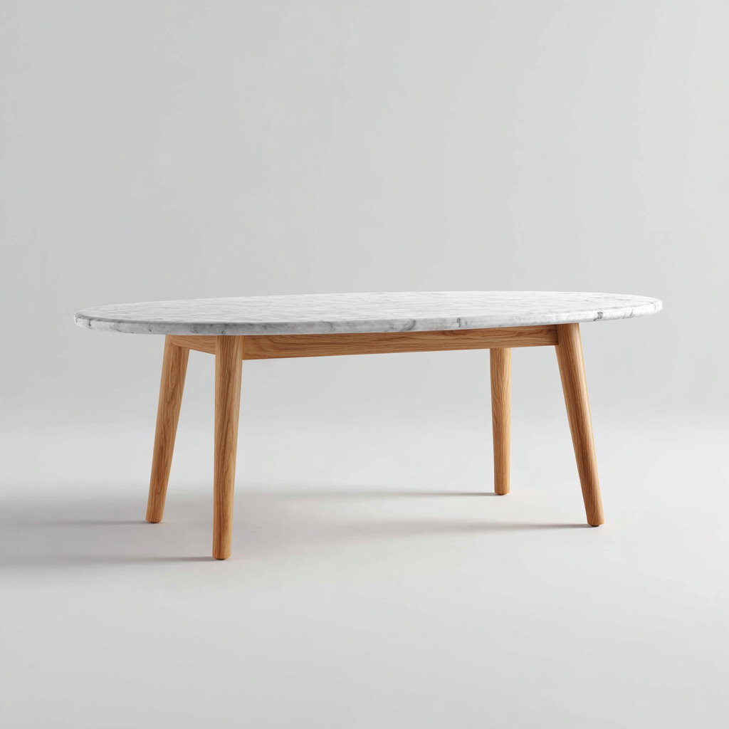 Il piano è realizzato in marmo bianco con venature leggere, mentre la struttura in legno naturale garantisce stabilità e un'estetica calda.