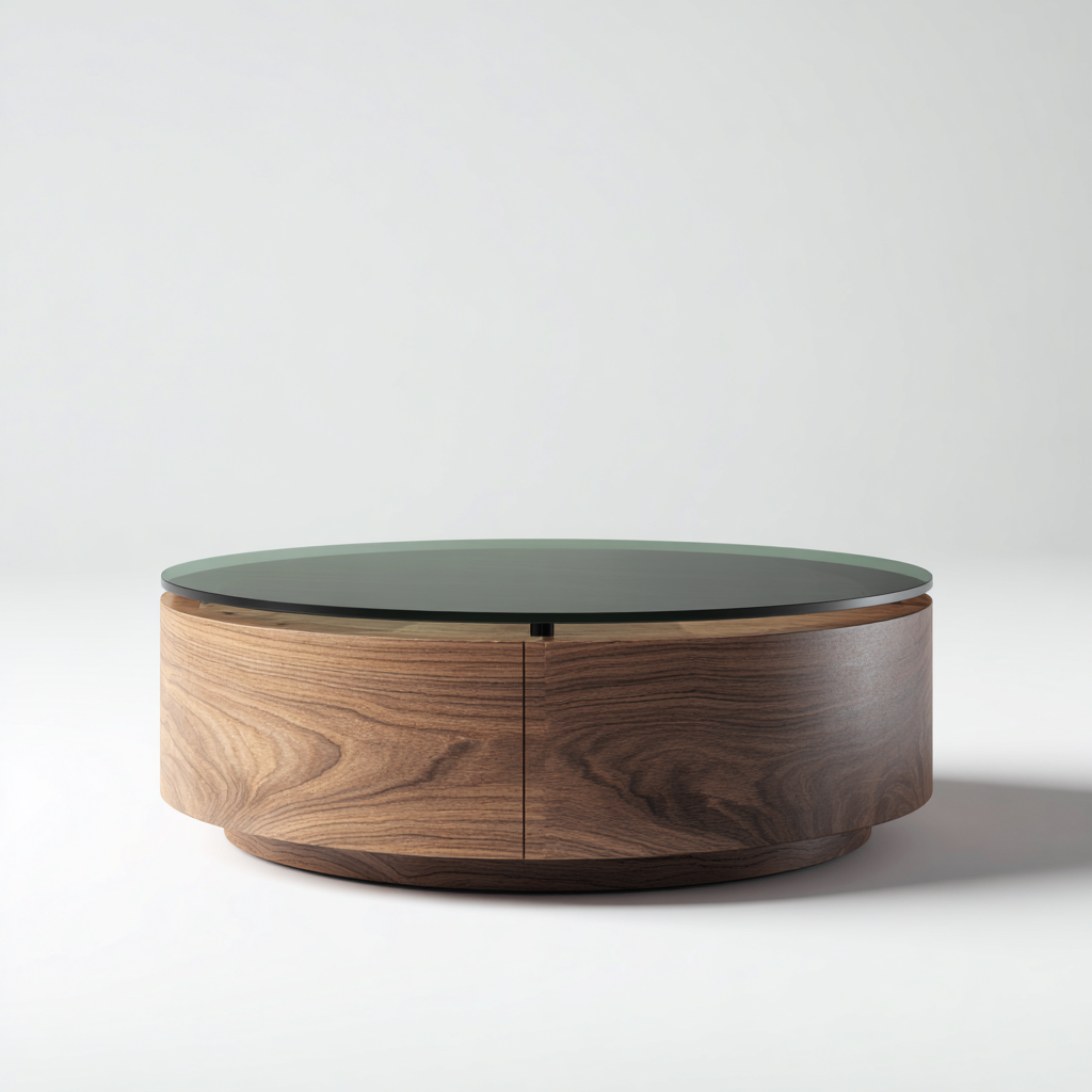 Questo tavolino da caffè rotondo unisce una base in legno con un piano in vetro, creando un elemento elegante e moderno pensato per il soggiorno. La forma compatta e armoniosa si integra facilmente in diversi stili d'arredo.