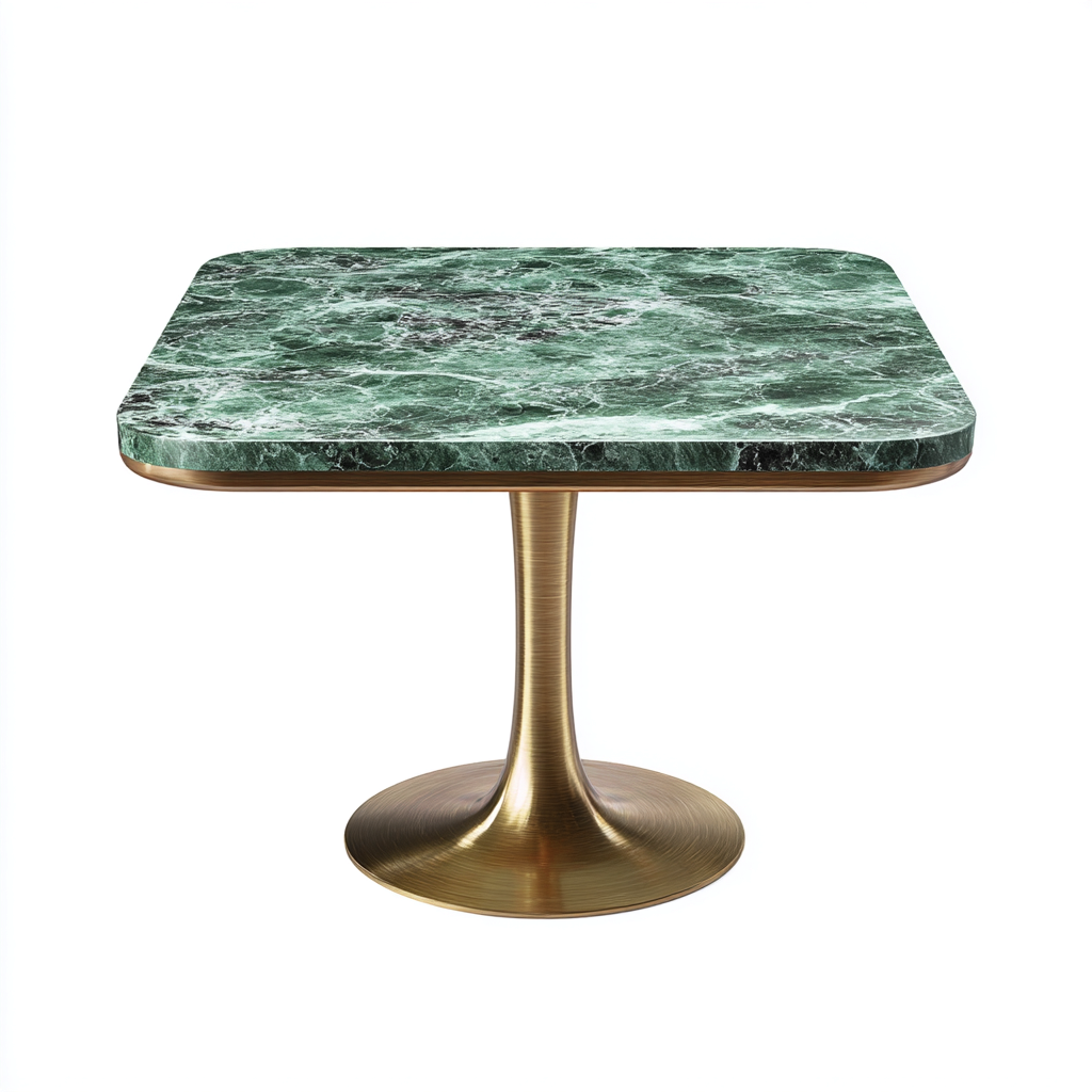 Il piano è realizzato in marmo verde con venature naturali uniche, mentre la base è in ottone spazzolato, donando stabilità e un effetto visivo di pregio. Le superfici sono rifinite con attenzione per un tocco liscio e duraturo.