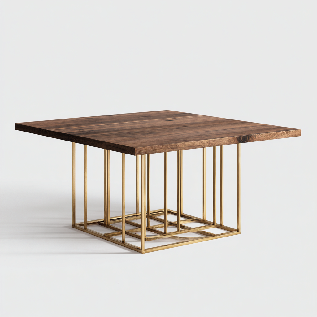 Il piano è realizzato in legno di noce con finitura liscia che valorizza la venatura naturale. La base in metallo con finitura oro è caratterizzata da una struttura aperta e geometrica, progettata per garantire stabilità e un forte impatto estetico.